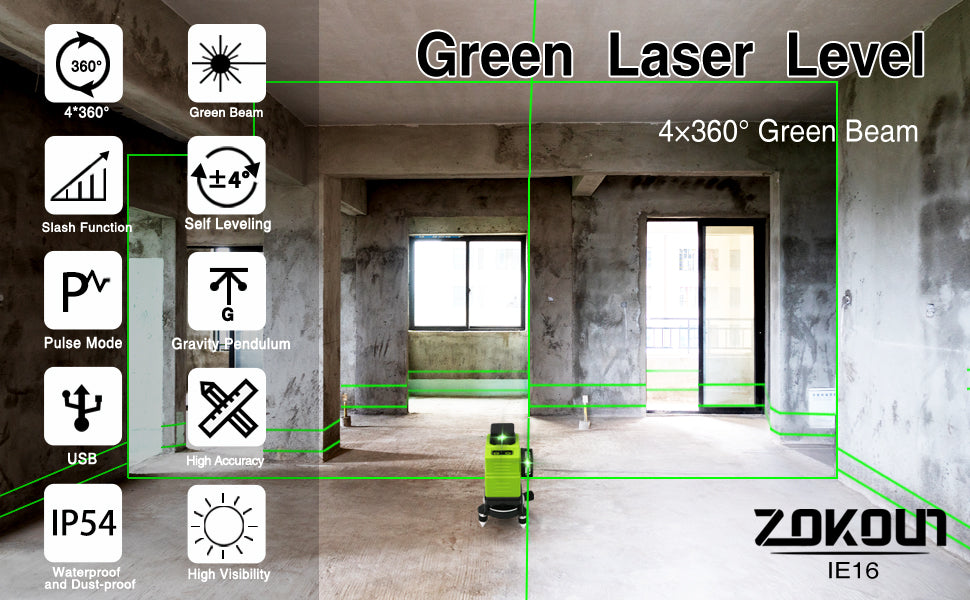 Zokoun Laser Module Floor and Wall Powerful Green 16 Lines, 360 Rotary Self-leveling Laser Level Horizontal&Vertical Cross With Wireless Control 4D Laser Level with Li-ion Battery (IE16)