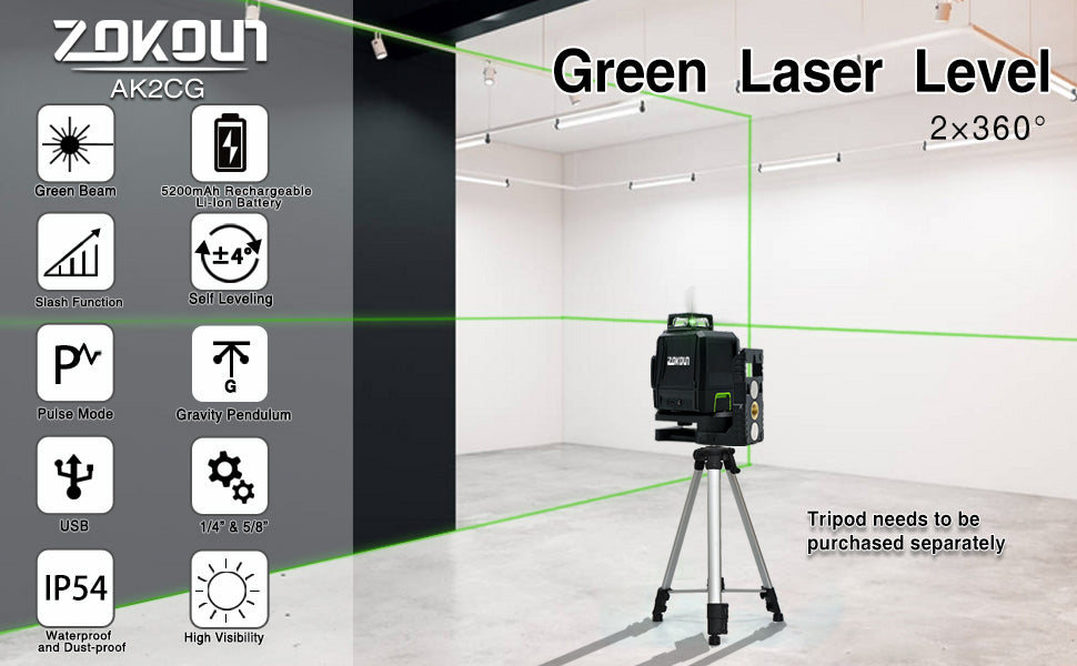Zokoun 2x360 Cross Line Laser, Self-Leveling Green Beam Laser Level Dual Plane Leveling and Alignment Line Laser Level -One 360° Horizontal and One 360° Vertical Line -Magnetic Pivoting(AK2CG)