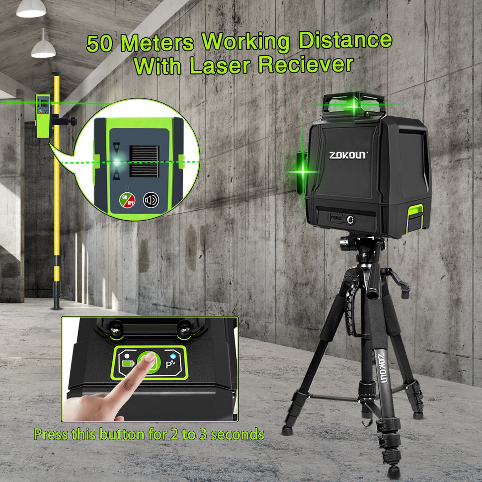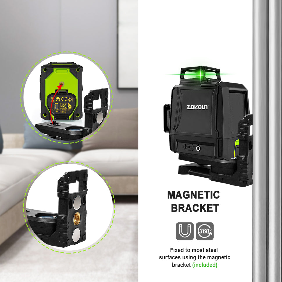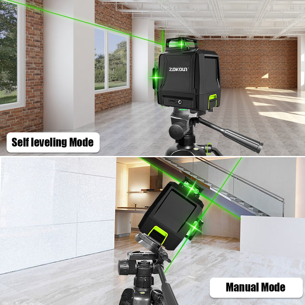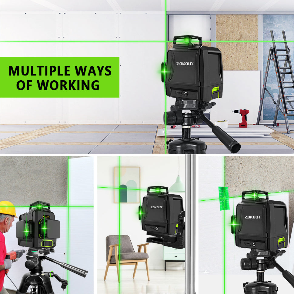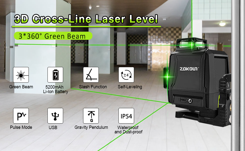 Zokoun 3D Laser Level Green AK360G with Pulse Mode, Switchable 3X 360 Cross Line 12Lines Self Leveling with USB Rechargeable Battery, 2X360 Vertical+1x360 Horizontal Lines, with 360° Magnetic Base